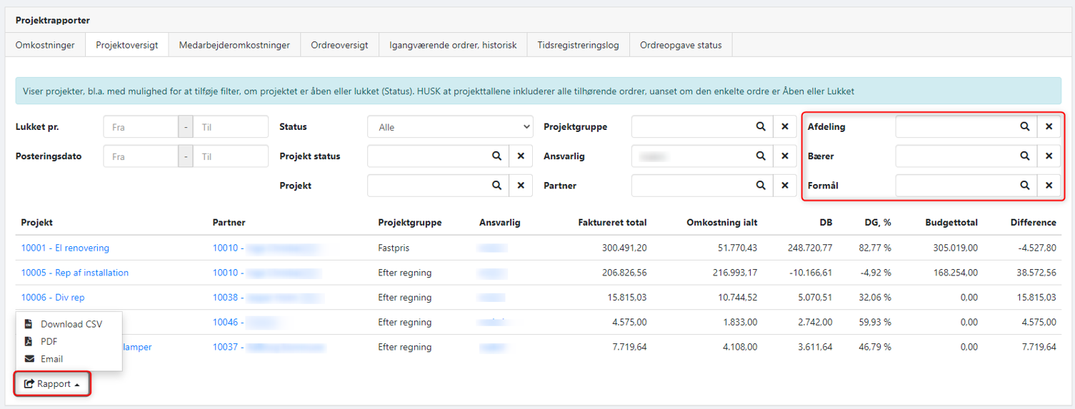 Vi har tilføjet flere filtreringsmuligheder til rapporten Projektoversigt, nemlig dimensionerne afdeling, bærer og formål. Du finder den via Projekt -> Rapporter -> fanen Projektoversigt. Her er også implementeret en ny multifunktionsknap til eksport af rapporten.