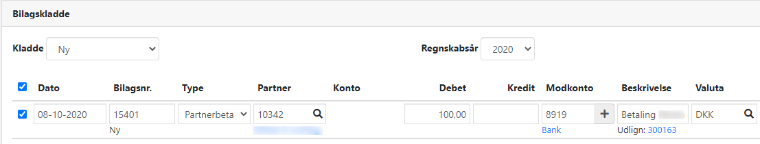 Efter du klikker på "Eksporter til finanskladde" sendes du direkte videre til den valgte kladde, hvor alle linjerne er gjort klar til bogføring og udligning.