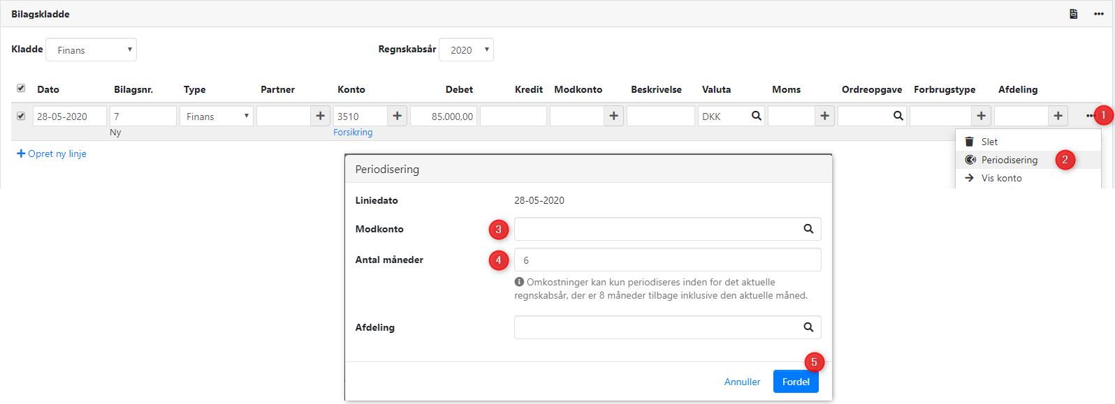 Udfyld omkostningslinjen og vælg 'Periodisering' fra linje menuen. Modkonto skal udfyldes og vælg antallet af måneder som omkostningen skal fordeles på. Klik på 'Fordel' og kladden vil derefter udfyldes med posteringer for det valgte antal måneder. Fordeling er alene muligt i indeværende regnskabsår.