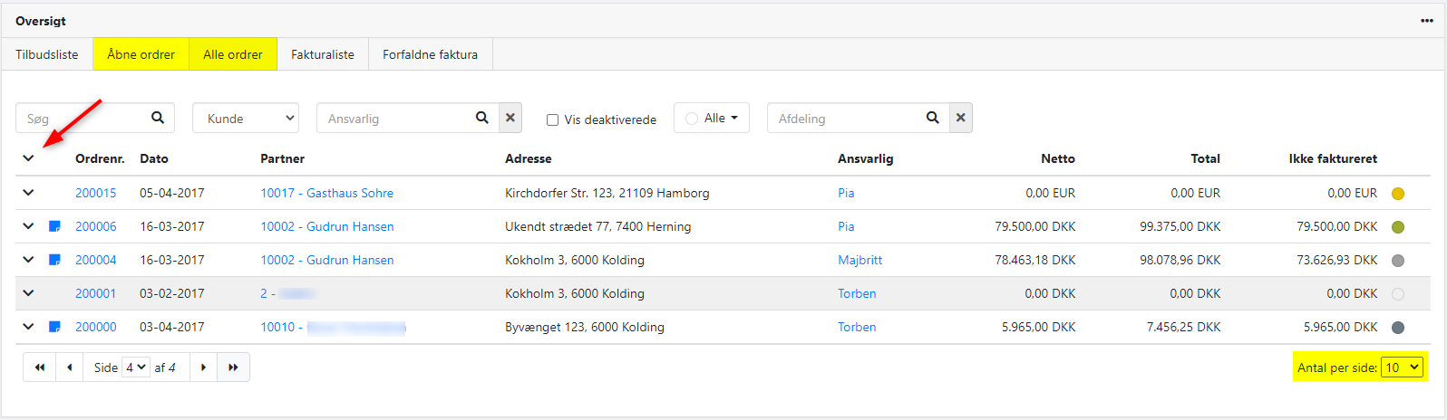 I ordreoversigten, fanerne 'Åbne ordrer' og 'Alle ordrer', er der tilføjet en mulighed for, at folde alle viste ordrer ud på én gang. Funktionaliteten er tilgængelig fra både købs- og salgsmodulet, ved visning af 10 eller 30 ordrer i listen.