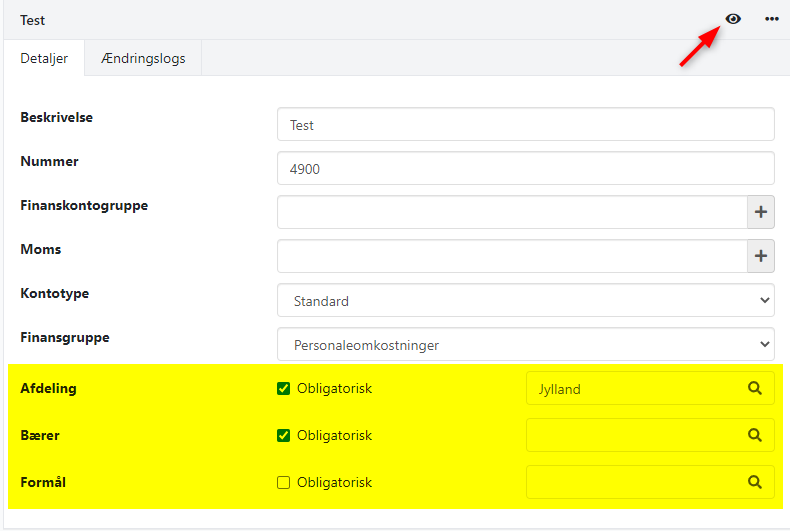 Hvis du anvender en eller flere af dimensionerne afdeling, bærer og formål til dine bogføringer, har du nu mulighed for at opsætte disse som obligatorisk på dine finanskonti.