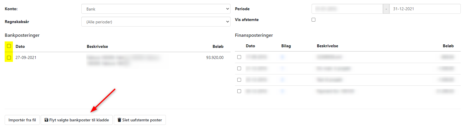 Tidligere har du kunnet vælge at flytte alle uafstemte poster fra din bankafstemning til din kassekladde. Vi har lavet nogle justeringer, så du nu kan vælge at flytte alene udvalgte posteringer. Du skal markere de posteringer du ønsker at flytte, for derefter at vælge 'Flyt valgte bankposter til kladde'. Du kan naturligvis fortsat vælge at flytte alle, ved et hurtigt klik øverst i listen.