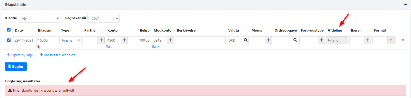 I bogføringsresultatet ses det tydeligt, at den valgte finanskonto kræver at der vælges en bærer, før bogføringen kan gennemføres.