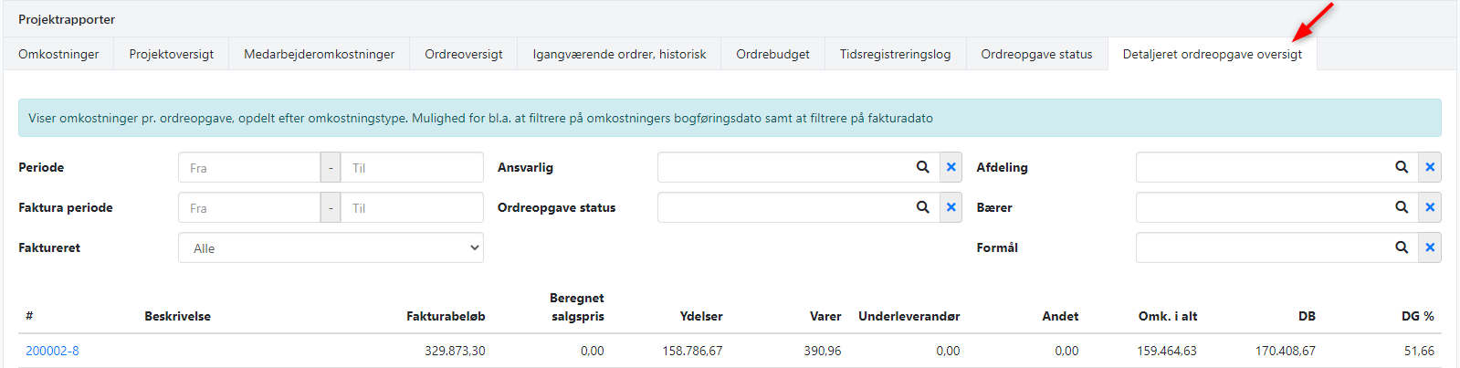 Der er tilføjet en ny projektrapport til samlingen, den hedder Detaljeret ordreopgave oversigt. Denne rapport viser omkostninger pr. ordreopgave, opdelt efter omkostningstype. Der er mange muligheder for at filtrere, f.eks. på omkostningers bogføringsdato samt om du f.eks.kun ønsker at se fakturerede opgaver. Rapporten kan desuden eksporteres som PDF, CSV eller vedhæftes direkte til en mail.