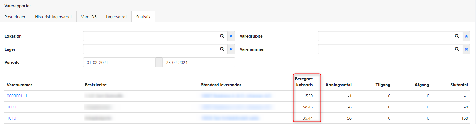 I varerapporten 'Statistik' kan der udskrives lister over alle lagerførte varer, som har haft en bevægelse i en valgt periode. Denne har tidligere alene angivet en beregnet købspris, hvis varen havde en beregnet gennemsnitspris angivet.