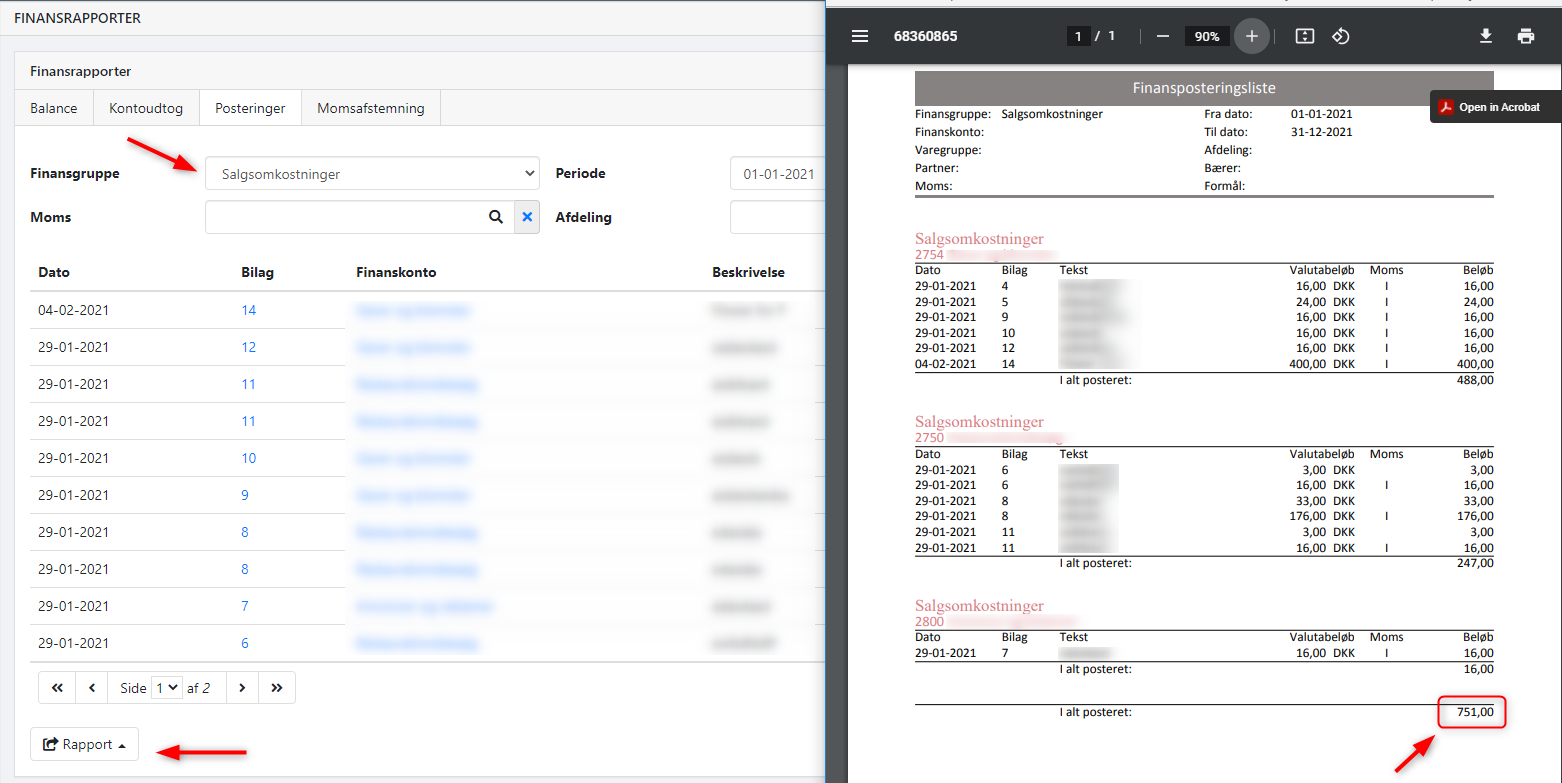 Hvis du ved brug af finansrapporten 'Posteringer' vælger at filtrere på én finansgruppe, vil der nu være en total angivet i bunden af rapporten, som summerer alle konti indenfor den valgte finansgruppe.