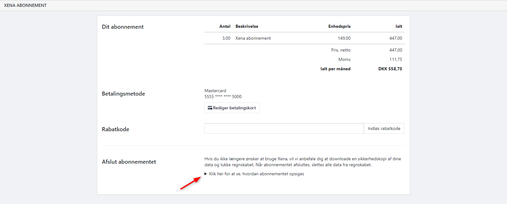 I forbindelse med udfasningen af Xena Free har vi redesignet abonnementsoversigten. Den findes under OPSÆTNING > VIRKSOMHED > ABONNEMENT. Det ikke længere muligt at nedgradere til den gratis version.
