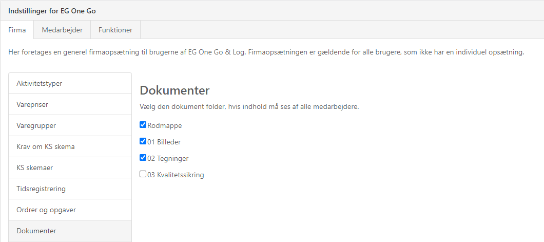 For at åbne adgangen til flere dokumentmapper, vælger du i EG One menuen: Opsætning -> EG One Go opsætning -> fanen 'Firma' -> Dokumenter. Her angives et flueben til de ønskede mapper.