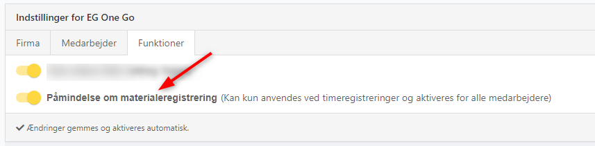 Du kan nu vælge at alle dine medarbejdere skal have en påmindelse om materialeregistrering, umiddelbart efter de har gemt en dagsregistrering af arbejdstid.