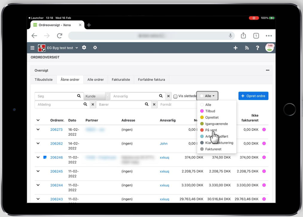 Alle menuer og lister kan nu tilgås, f.eks. valg af status i ordreoversigten
