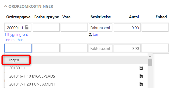 I feltet til valg af ordreopgave, hedder den øverste linje i listen nu 'Ingen', så du ikke ved en fejl får valgt den øverste opgave i listen, hvis du benytter tabulator tasten til at skifte mellem felterne.