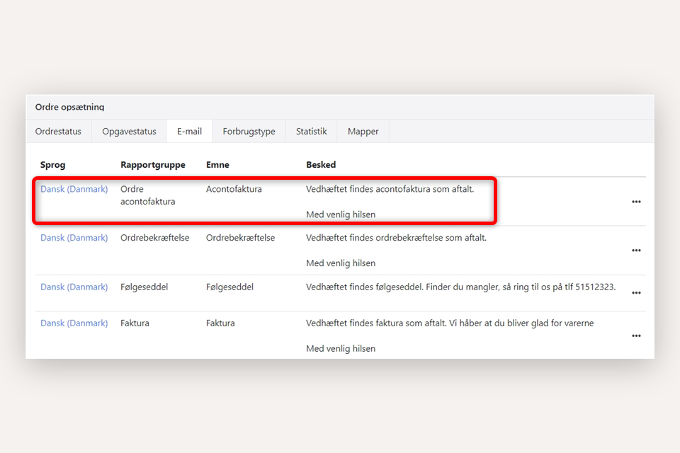 Hvis du har opsat egne tekster i forbindelse med afsendelse af fakturaer via e-mail, skal du lave samme opsætning for den nye rapport 'Ordre Acontofaktura' under menuen Opsætning > Ordreopsætning > E-mail: