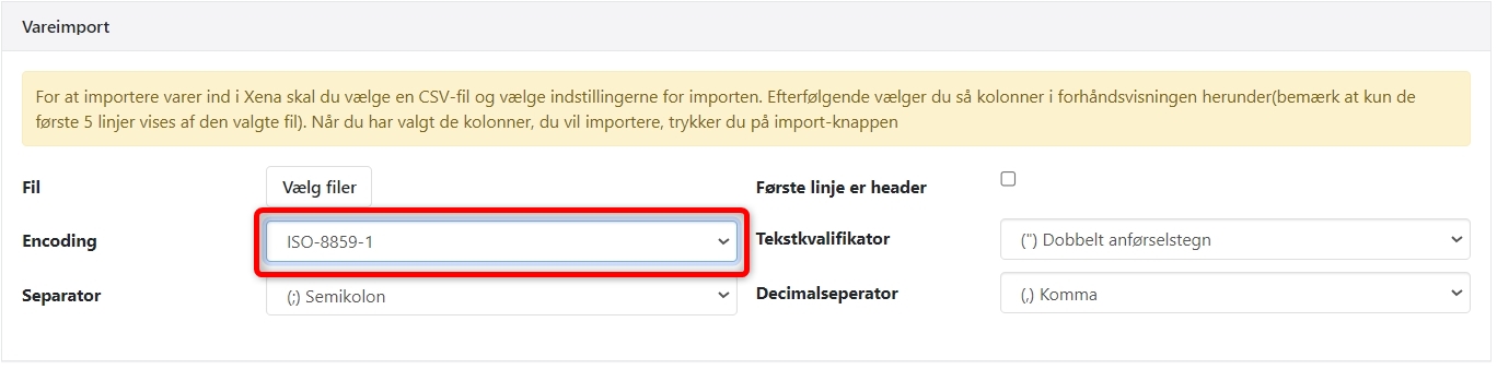 Ved import af data fra CSV-filer til Xena er det afgørende at vælge den korrekte encoding. Hvis du vælger en forkert encoding, kan det medføre, at tegn som æ, ø, og å ikke indlæses korrekt. For at sikre en problemfri import har vi ændret standardvalget for encoding til ISO-8859-1, da dette typisk er det korrekte valg for at få de danske tegn indlæst korrekt.