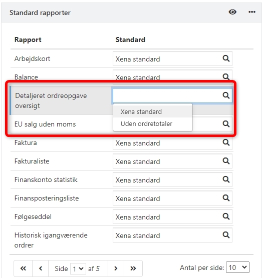 Hvis du har en brugertilpasset version, men ønsker at skifte til en af de nye standarder, skal du i rapportvalget for Detaljeret ordreopgave oversigt vælge Xena standard eller Uden ordretotaler. Du kan læse mere om, hvordan du skifter rapportvalg her.