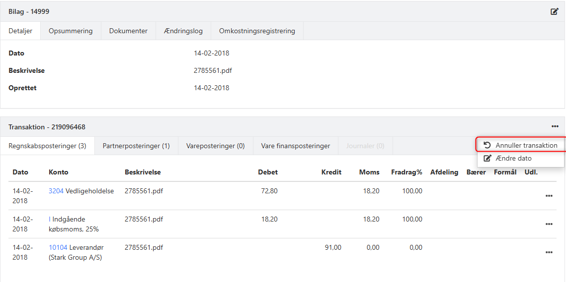 Hvis du har behov for at ompostere et bilag, skal du allerførst annullere den oprindelige transaktion.