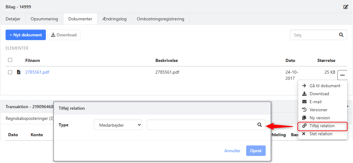 - I menuen ud for bilaget vælger du Tilføj relation