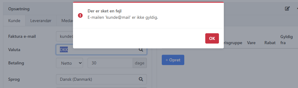 Hvis der findes e-mailadresser i dit regnskab, som ikke opfylder kravene, vil du blive bedt om at opdatere dem næste gang, du redigerer de relevante oplysninger — f.eks. på en partner eller en ordre.
