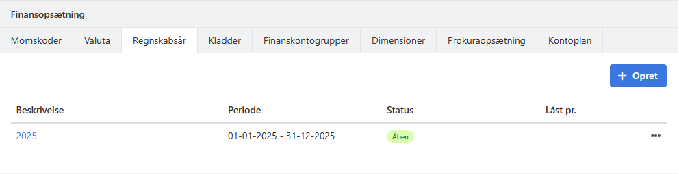 Du opretter og vedligeholder dine regnskabsår her: Opsætning > Finansopsætning > Regnskabsår.