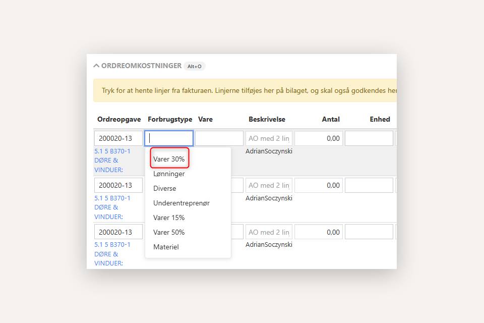 Fremover vil de forbrugstyper, der er tilknyttet den valgte ordre under fanen Fakturering, blive listet øverst. I det følgende eksempel har jeg valgt forbrugstypen Varer 30% på den tilknyttede ordre, og derfor står denne forbrugstype øverst i listen.