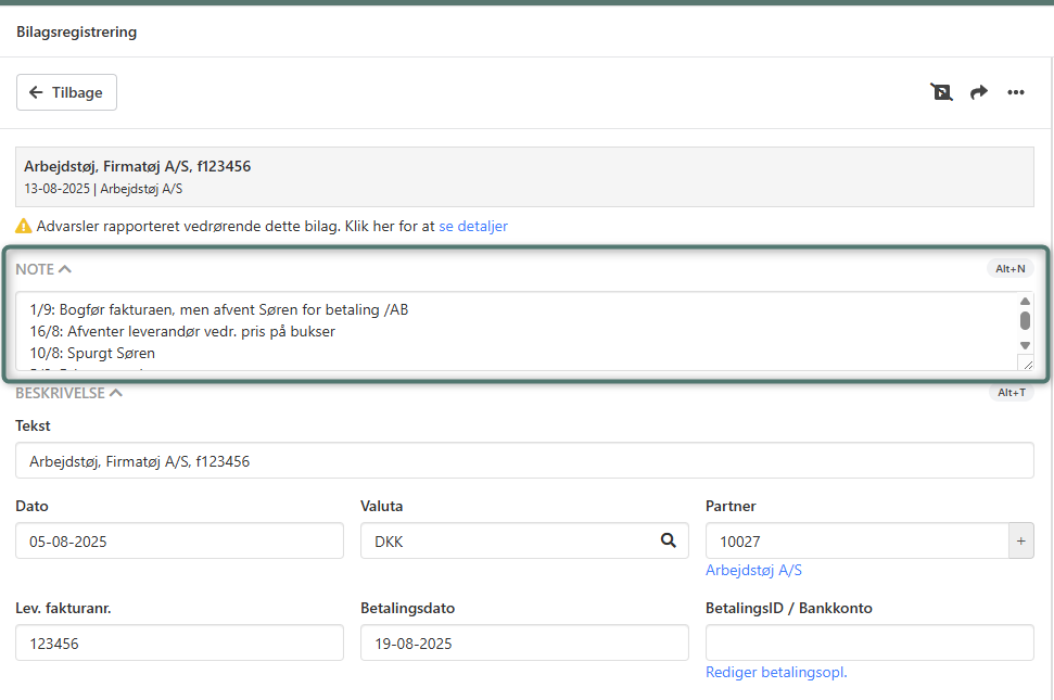 Sektionen Note i Bilagsregistrering er blevet reduceret i størrelse, da mange brugere oplevede, at det fyldte for meget i skærmbilledet. Er der mere end 3 linjer med noter, kan du enten scrolle i teksten, eller udvide feltet ved at trække i nederste højre hjørne med musen.