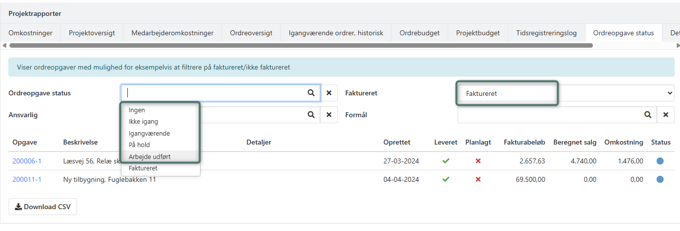 👉 Hvis nogle fakturerede opgaver stadig fremgår, kan det skyldes, at de ikke har den korrekte opgavestatus. Du kan kontrollere dette i rapporten: