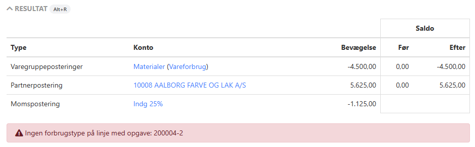 Hvis en linje mangler en forbrugstype, kan omkostningen ikke godkendes. I så fald vil der blive vist en fejlmeddelelse nederst i bilaget, og knappen Bogfør/Godkend bliver deaktiveret, indtil fejlen er rettet.