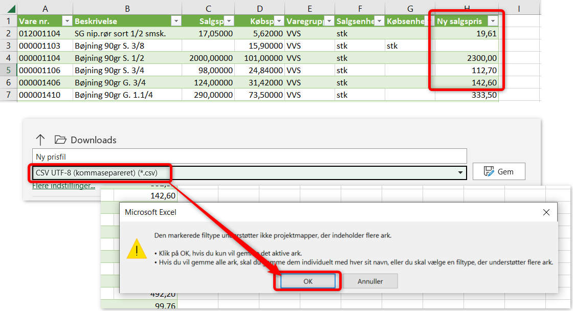 - For at kunne importere varerne i Xena igen, skal du gemme filen som CSV