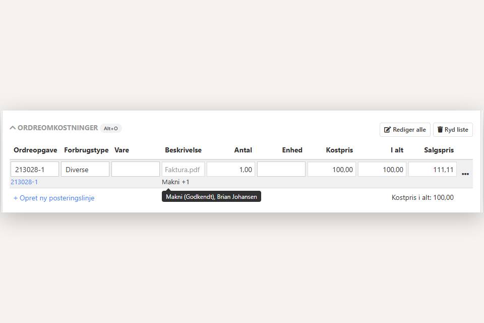 - Omkostningsregistrering: Registreringer skal godkendes af den ordreansvarlige på fanen Godkendelse.