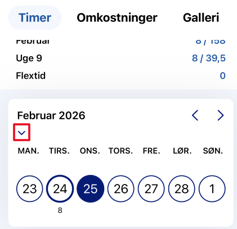 Når du står på datoen, kan du se i bunden, hvilke timer du har registreret på den givne dato.