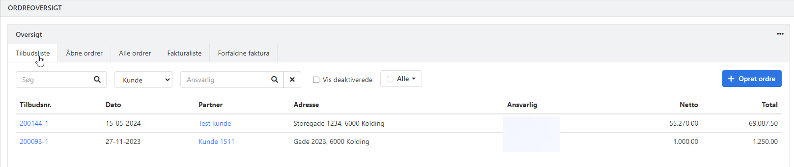 Viser ordrer hvor det er opprettet et tilbud. Ønsker du ytterligere filtrering av dine tilbud, kan du f.eks. opprette en ordrestatus som heter 'Aksepterte tilbud' og en ordrestatus som heter 'Avslåtte tilbud'. Nå kan du endre status på ordren etter hvert som dine tilbud aksepteres eller avslås, så du alltid har en oversikt over dine pågående tilbud.