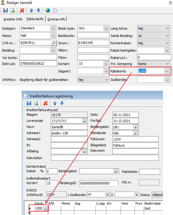 Sættes der købskonto på kreditor, vil denne konto blive hente som foretrukken på finanslinien i købsfakturaen ved tastning og indlæsning af EDI, OIO eller fakturainscanning.