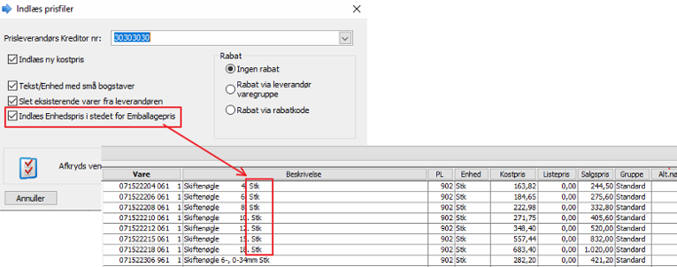 Når prisfilen indlæses, sætter man et flueben i "Indlæs Enhedspris i stedet.....", herefter vil enhedsbetegnelsen også stå i varebeskrivelsen.