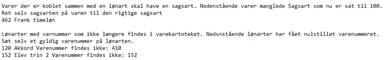 Kontrollisten gør fremover opmærksom på, hvis der er en lønart på en vare, som ikke matcher varenummer på lønarten. Lønarten på varen vil altid overskrive varenummer på lønarten.