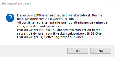 Svares der JA, bliver sagsarterne slettet og man skal manuelt ind og sætte sagsart på de varer, som skal udlæses til EG One.