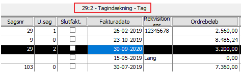 Står man på en ordre med sagsnummer vises sagsnavnet over kolonnen fakturadato.