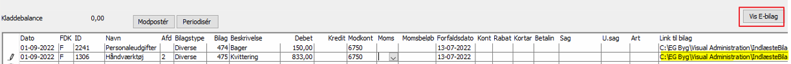 Ønsker man at se kvitteringen inden bogføring, skal man stå på kladdelinien og trykke på "Vis E-bilag"