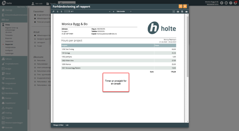 NY rapport "Timer pr. projekt". Rapporten viser det samlede antal timer pr. projekt for medarbejdere. Rapporten kan grupperes pr. projekt eller pr. medarbejder