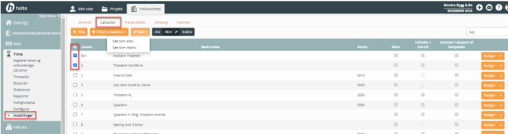 I Firma -> Indstillinger -> Lønarter er det nu muligt at vælge flere lønarter og sætte dem som inaktive / aktive.