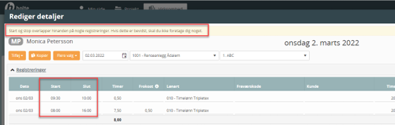 Hvis der er tilføjet timer med overlappende tidsintervaller i start/stop, oplyser vi herom.