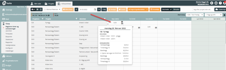 Ved at holde musemarkøren over en tidsregistrering, vises tidsregistrering og omkostninger.