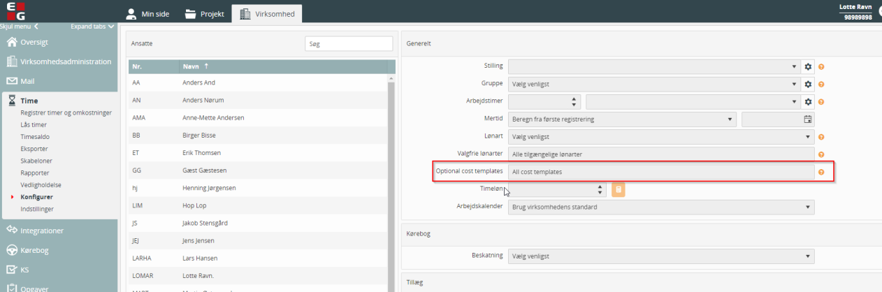 Under Virksomhed, Time og Konfigurer er det nu muligt at vælge, hvilke omkostninger den enkelte medarbejder skal kunne tilgå. Vælges der ingen omkostninger vil medarbejderen have adgang til alle omkostningsskabeloner.