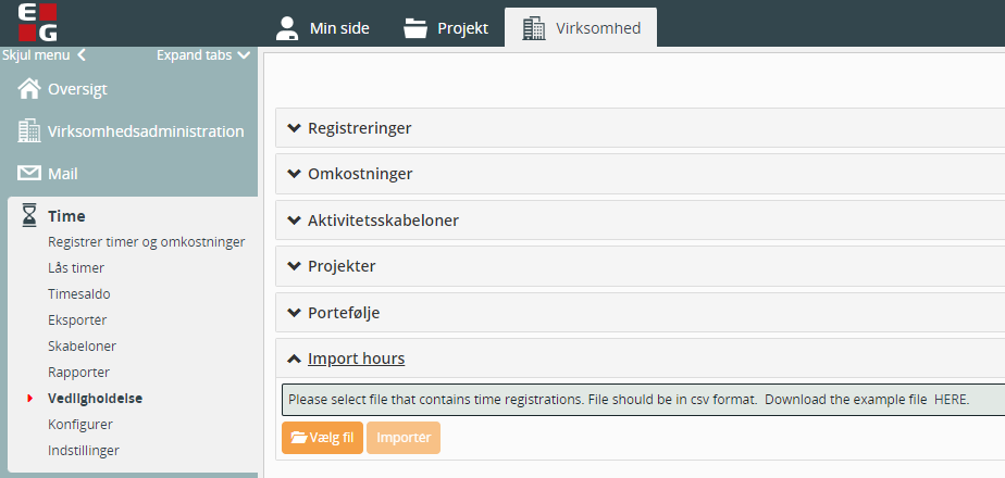 Ny funktion gør det muligt at importere timer til EG Construction under Virksomhed, Time, Vedligeholdelse og Importer timer.