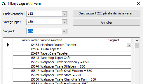 Vælg prisleverandør, varegruppe og sagsart og tryk på "Sæt sagsart xxx på alle de viste varer"