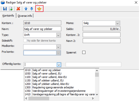 Hvis du vil se kontoplanen på Erhvervsstyrelsens hjemmeside, kan du trykke på krone-ikonet øverst i billedet på kontoen. Lidt nede på siden finder du den Offentlig kontoplan i excel-format og tilhørende momskoder.