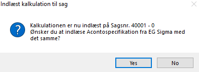 Når kalkulationen er indlæst, kan du svare JA til at indlæse Acontospecifikationen med det samme.
