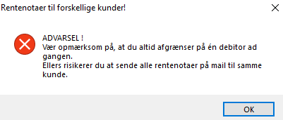 Ved afsendelse af Rentenotaer og Rykkerskrivelser skal man huske at afgrænse på en enkelt kunde ad gangen. Hvis man alligevel glemmer det, vil der komme en advarsel, når der trykkes på Vis rentenota/rykkerskrivelse.