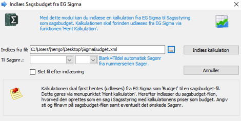 Tryk Indlæs sagsbudget og udpeg kalkulations-filen fra Sigma.