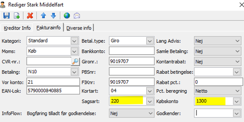 Det er nu muligt at taste i felterne Sagsart og Købskonto på kreditor stamkortet under Fakturainfo.