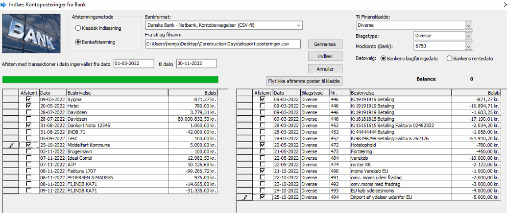 Højre kolonne viser bogførte posteringer på bankkontoen i EG Visual og venstre kolonne viser indlæste posteringer fra bankfilen.