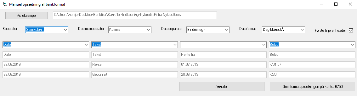 Åben bankfilen med Notepad og vælg separator for fil, decimal, dato og vælg/fravælg overskrift.